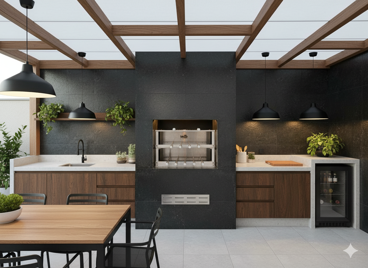 Churrasqueira manual compacta, perfeita para alvenarias menores e para quem prefere o tradicional espeto parado.