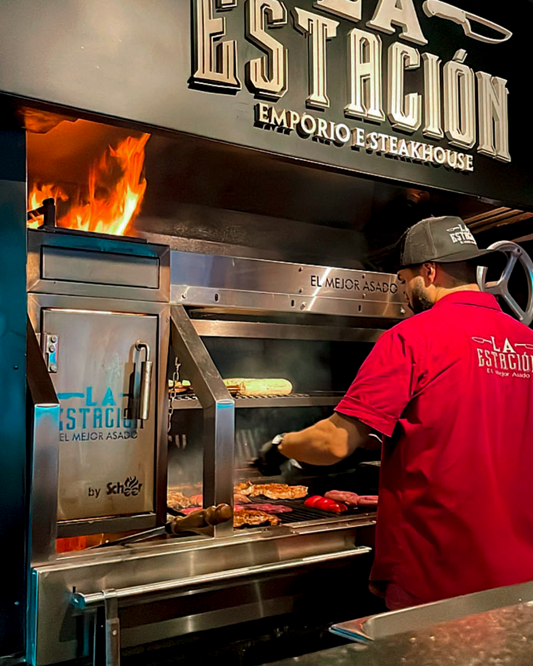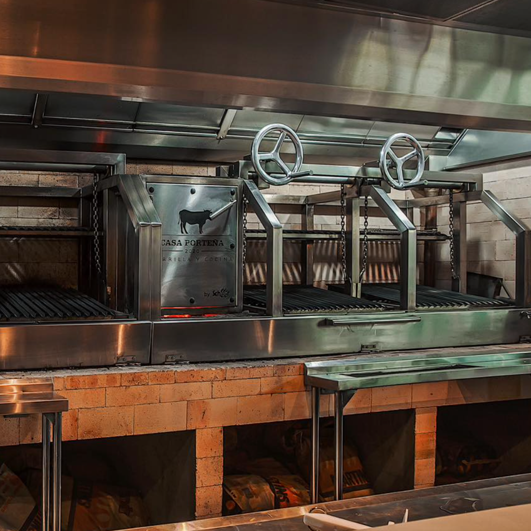 Parrillas profissionais a carvão Scheer: inox, braseiro lenha/carvão, altura regulável, módulos configuráveis, prontas para uso ou para alvenaria.